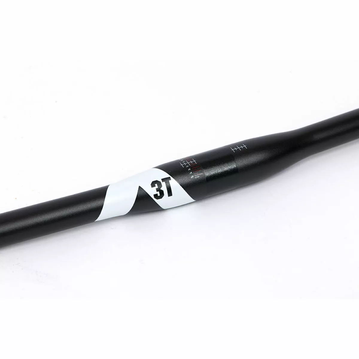 3T compact-cockpit design leaves 285 mm total width to either side of stem bulge to mount lock-out levers, cameras, and lights as well as grips, shifters, and brake levers. Bar can be cut down to 680 mm width if required. Flat 740 Pro is built in AL 7075, finished shot-peened and black anodized, and weighs 240 g (uncut).