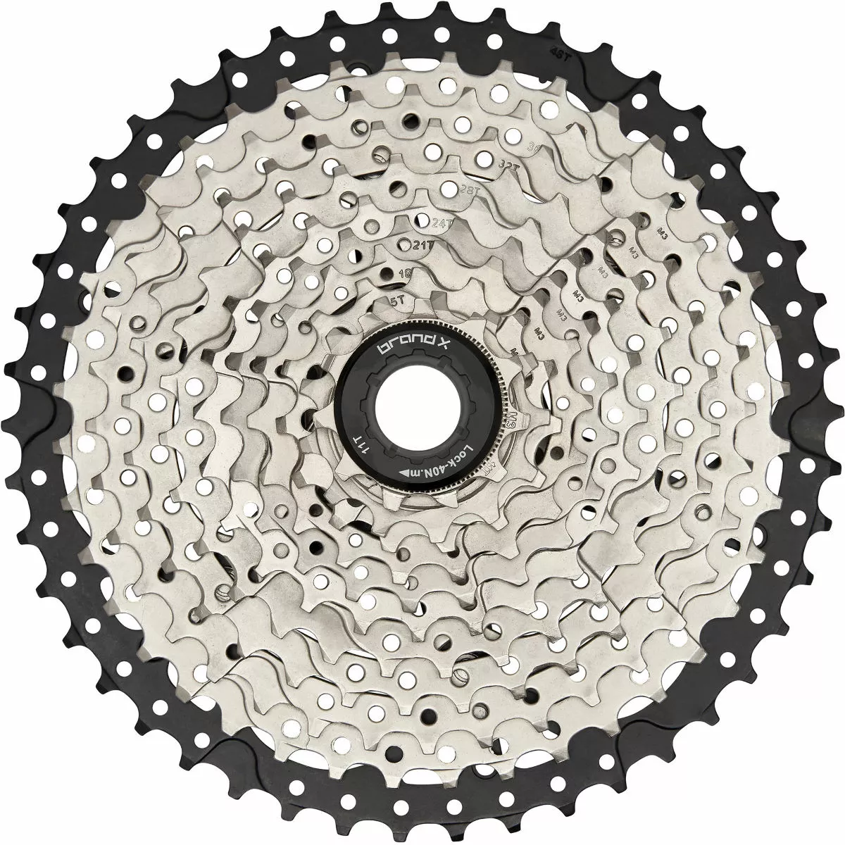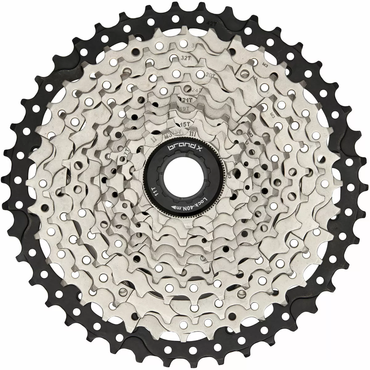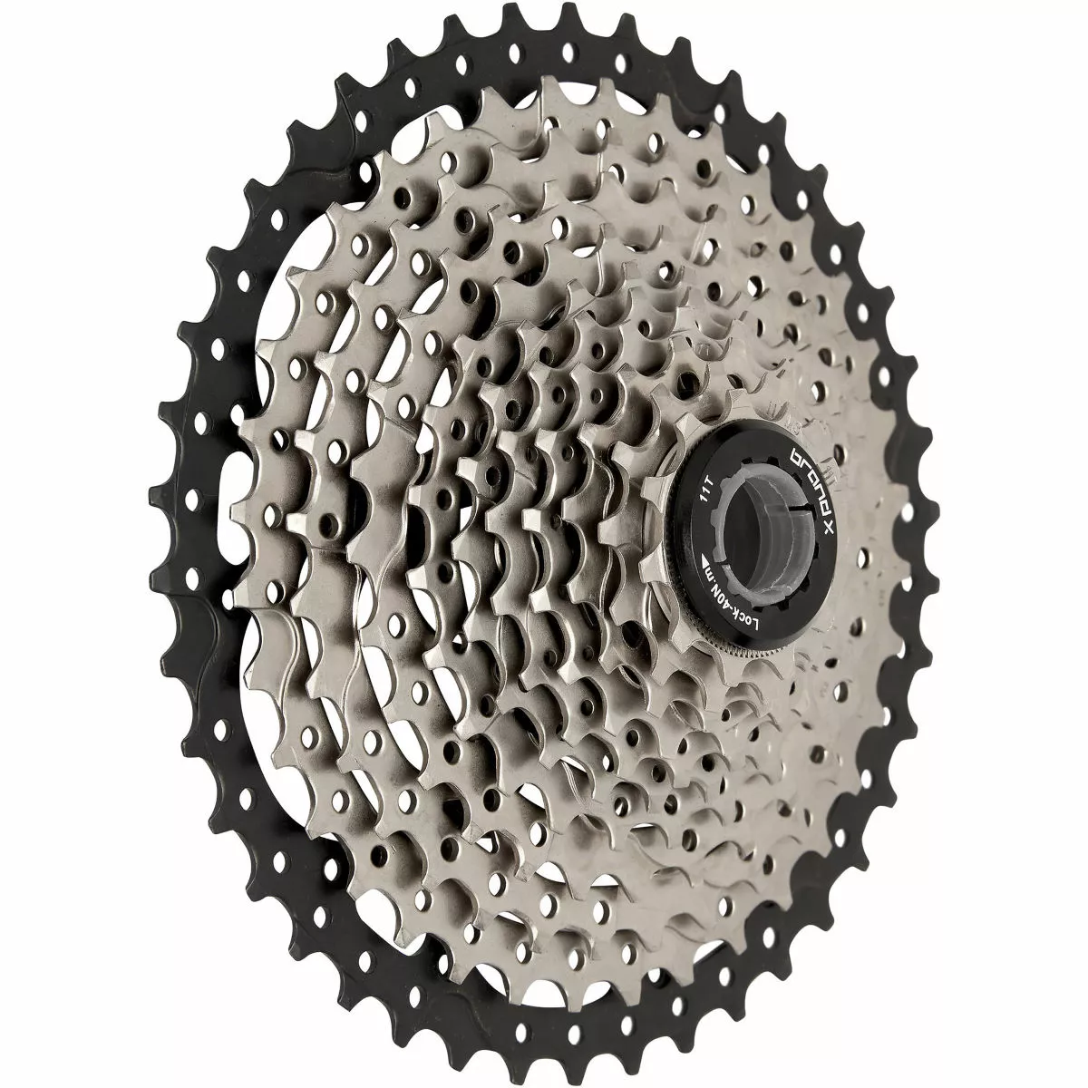 The Brand-X 11 speed MTB cassette is the perfect replacement for your 11 speed cassette. Available in both 11-42t and 11-46t options depending on your ratio requirement. The cassette uses a standard Shimano HG spline and its high tensile steel cogs are mounted on a 7075 alloy spider for maximum durability while keeping weight to a minimum. The tooth profile is also optimised to aid gear changes and reduce noise.