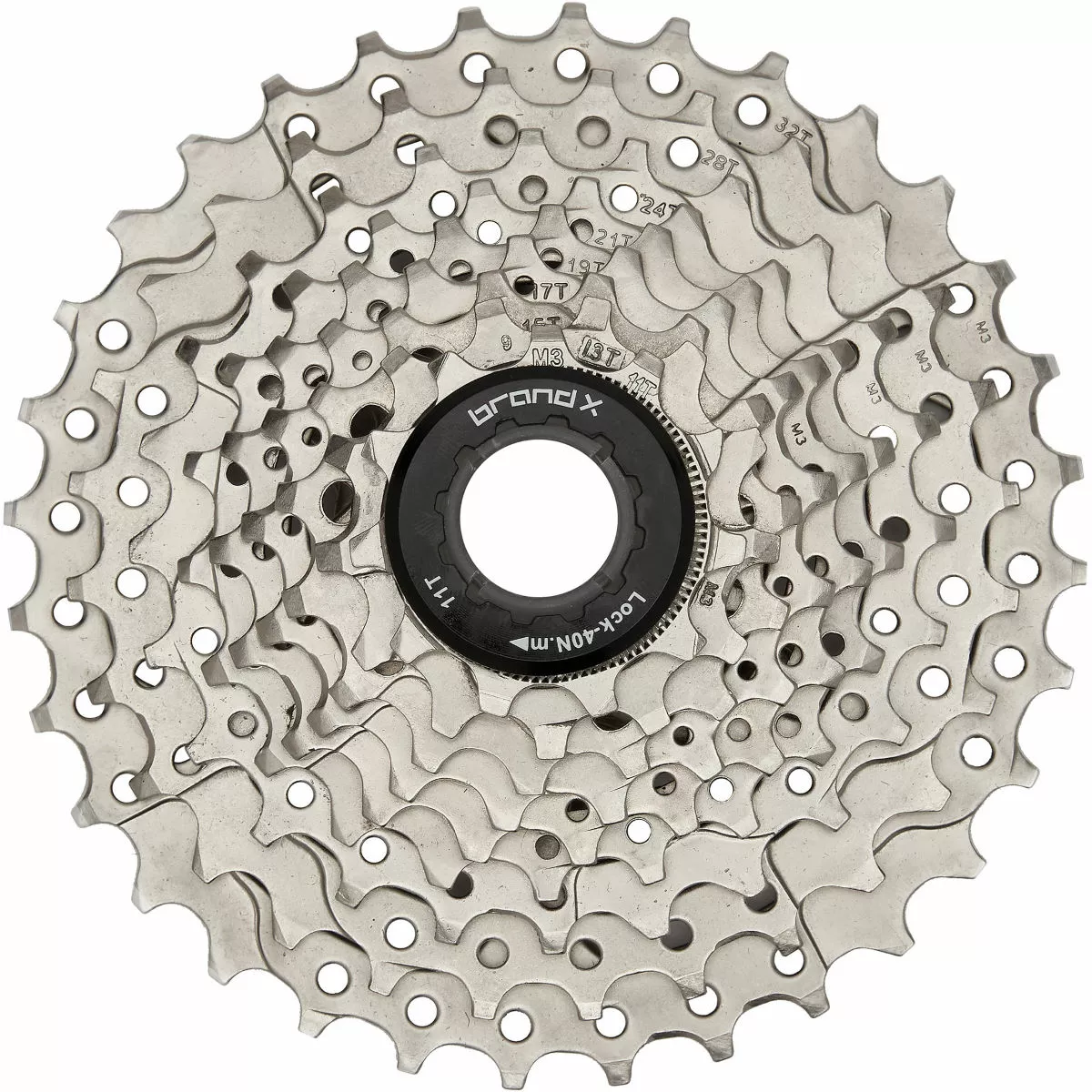 The Brand-X 9 speed 11-32t MTB cassette is the perfect replacement for your 9 speed cassette. The cassette uses a standard Shimano HG spline and is made from high tensile steel so it’s super hard wearing. The tooth profile has been optimised to aid gear changes and reduce noise.