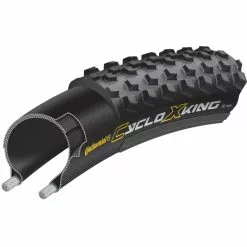 Continental developed a tread pattern that is studded enough to work well in muddy conditions, yet roll like a semi slick in a straight line. The tall shoulder lugs do provide great bite in the loose and wet corners and of course, their special BlackChili compound boosts grip in all situations whether they be hard & dry, cold & wet, roots, off-cambers, grass or stone. When the tyre deforms under impact with the ground, the BlackChili compound absorbs the shock and propels you forward like no other tyre. It’s fast, grippy and it lasts as long as a harder compound tyre, giving you great value for money and the 32mm RaceSport version is UCI legal.