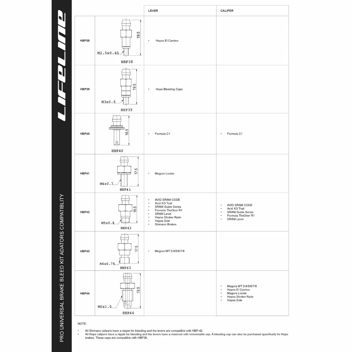 The kit includes 8 nipple adaptors. Each nipple adaptor is specific to the brake caliper and lever and so please refer to the chart to check the required fitment.