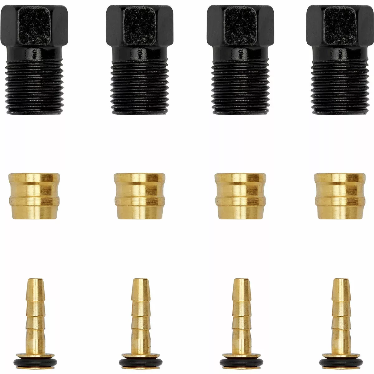 This 12 piece kit contains four copper olives, four inserts/barbs and four steel nuts. The inserts/barbs are designed to fit 2.5mm inner diameter hose for Tektro brakes. The olives are designed to fit 5.5mm outer diameter hose and the nuts are M8 x 0.75mm for 5.5mm outer diameter hose.