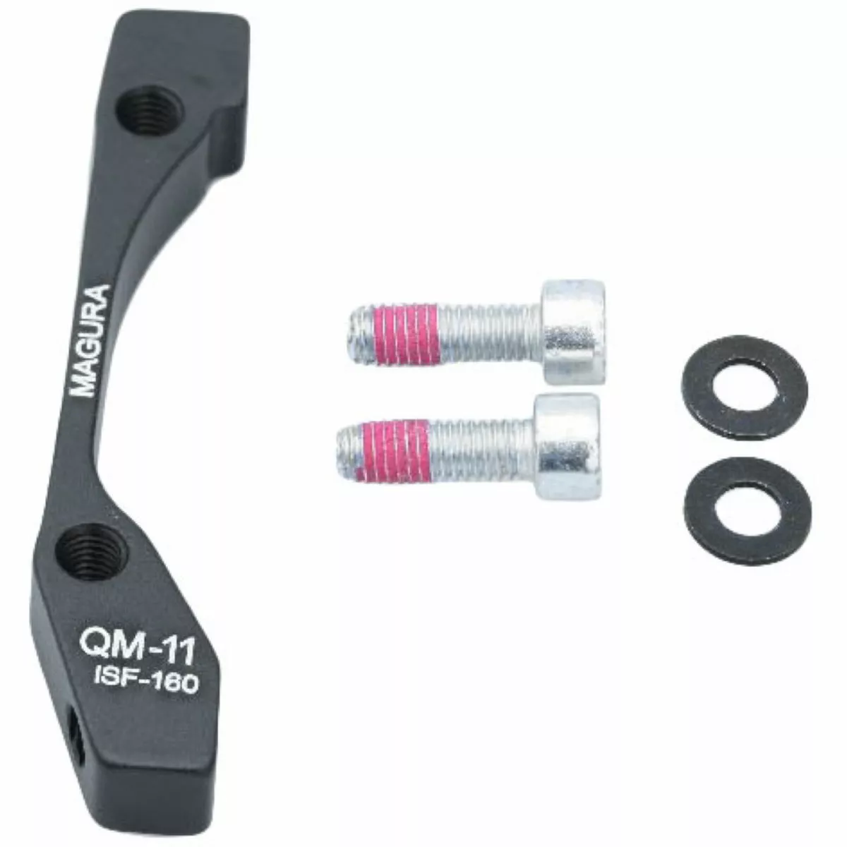 Adapts Post-mount (PM) caliper to International Standard (IS) fork mount (6″/160mm) for use with 180mm rotor in front, and adapts PM caliper to IS frame rear for 160mm rotor