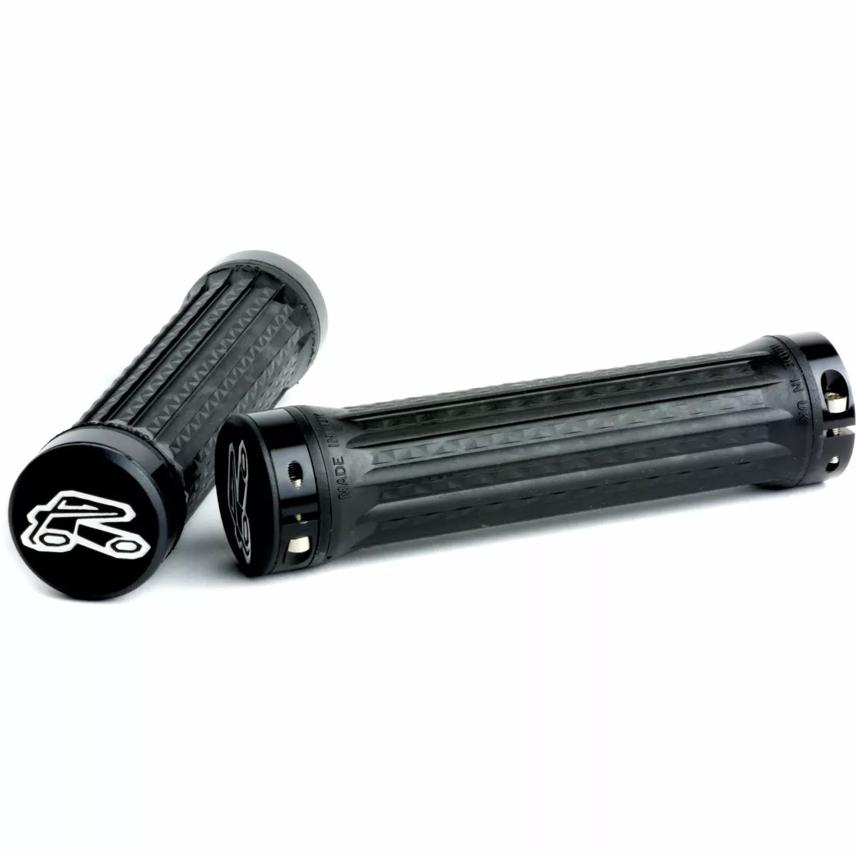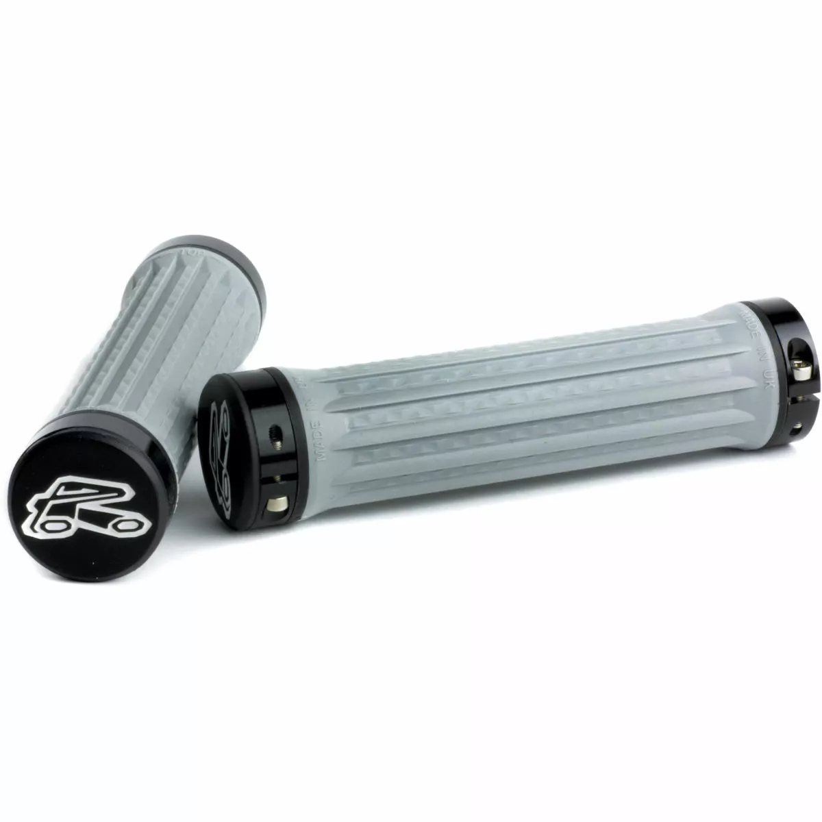 Rearward Facing Angled Palm Grooves: When braking or steep descending, the majority of the torque and grip is concentrated through the palm. Grooves cut with a rearward facing angle give improved grip in this situation. As the ramped groove is cut into the grip, it gives a comfortable, large surface area for the palm in normal riding conditions.
