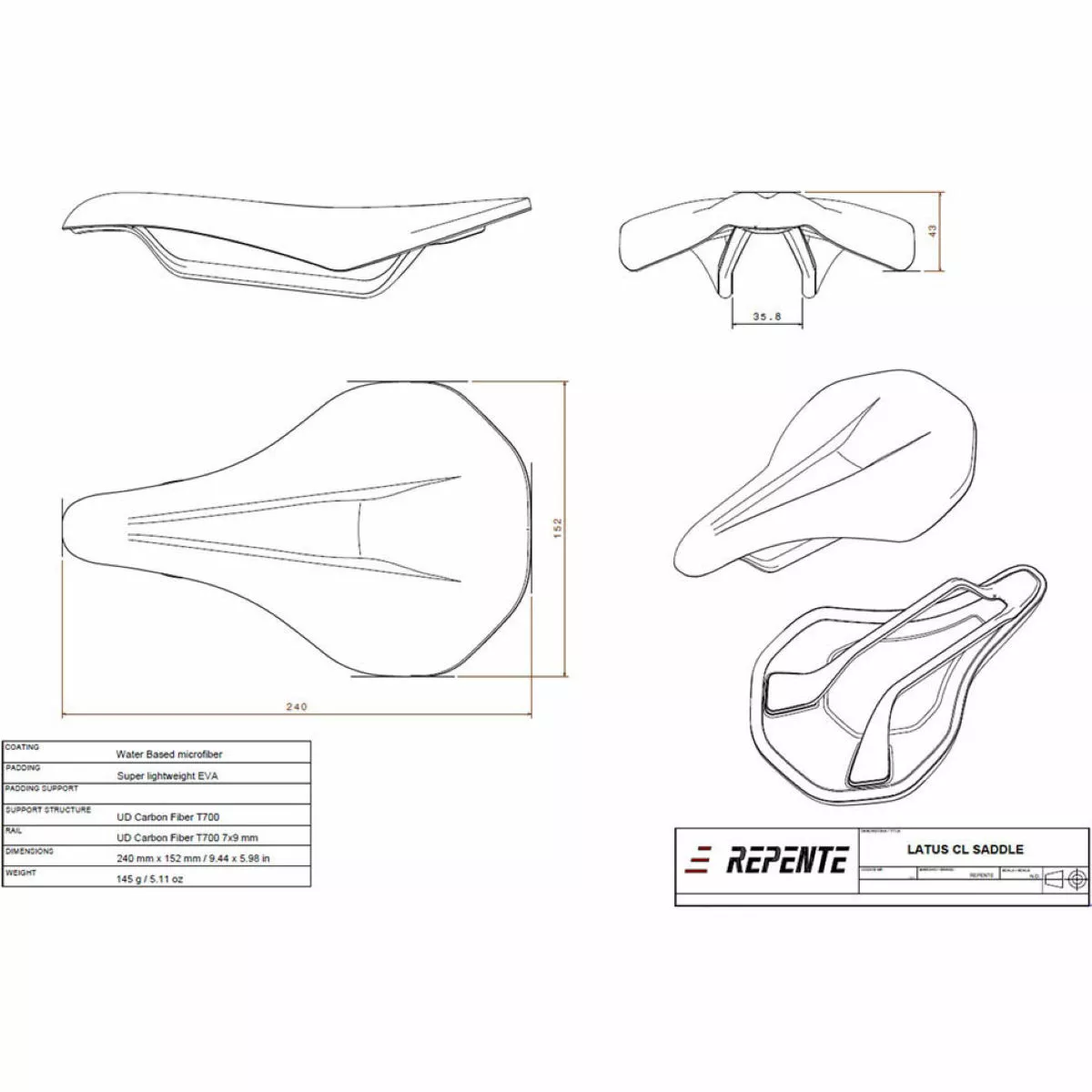 By trimming the weight of this saddle down to only 145 grams and creating the entire structure by autoclave processing, Repente was able to ensure a more compact and uniform carbon fibre texture, enhancing the mechanical properties of the material as no other machining process can do. Latus CL has a flattened rear surface to offer the best support even in the case of very far apart ischial tuberosities (“sit bones”).