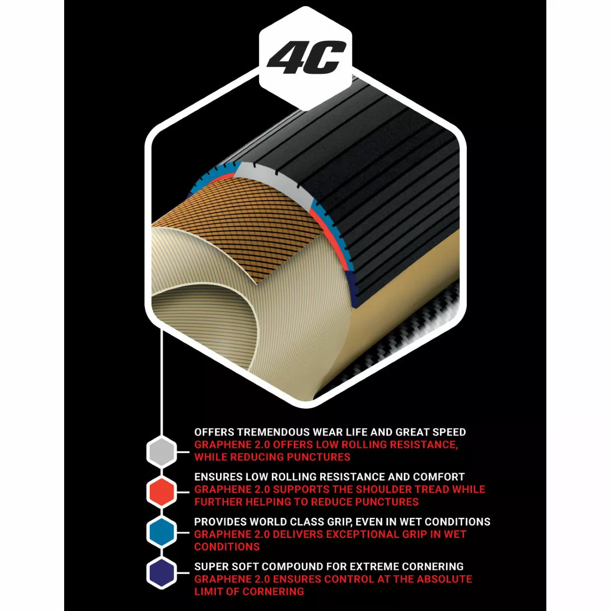 Combining a rapid-running Graphene 2.0 compound with a 4C-layered material, this race-ready tyre gives unrivalled road grip and durability. Ideal for taking on steep inclines and speedy sprints, it delivers a championship-winning performance on every outing.